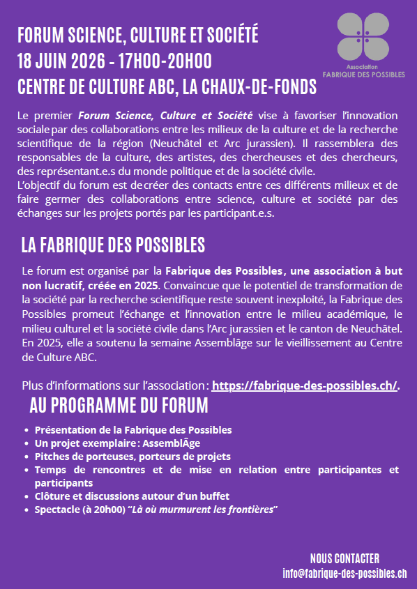 AssemblÂge est une semaine d’événements qui se déroulera au Centre Culturel ABC à la Chaux-de-Fonds du 22 au 26 octobre 2025. Une pièce de théâtre de Nicolas Yazgi en est l’élément phare. Elle se fonde sur les résultats d’une recherche scientifique et s’inscrit dans la lignée des forums théâtraux (Staging Age I & II) déjà réalisés.